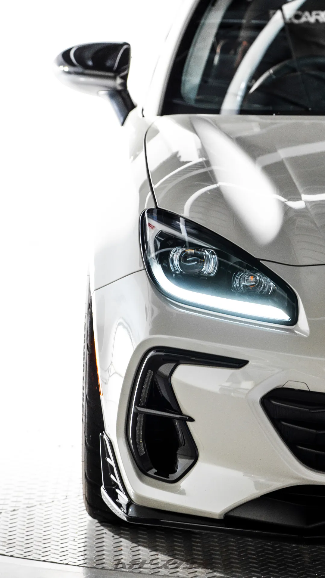 縦画像でBRZのライトとエアロパーツを中心に、レカロシートがチラ見えするイメージカットです。